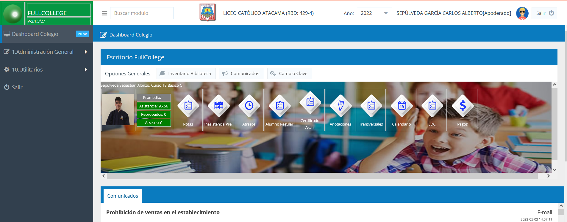 Ahora contamos con un sistema llamado Fullcollege, este sistema permite que el apoderado adquiera el certificado de alumno regular y todo lo que tenga relación con el estudiante.
